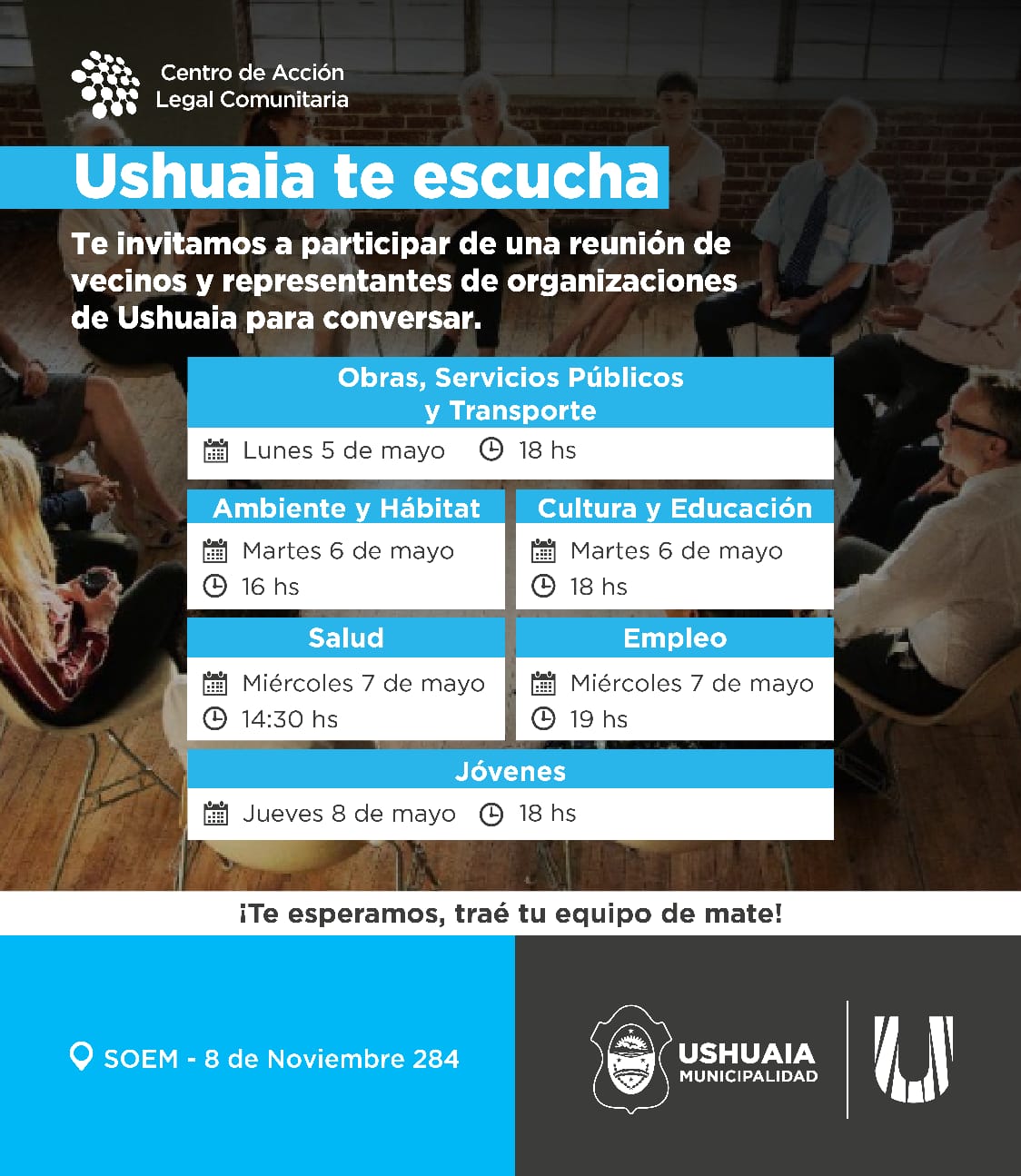 La Municipalidad de Ushuaia invita a los vecinos y vecinas a formar parte de los talleres “Ushuaia Te Escucha”, con el objetivo de garantizar espacios abiertos de participación ciudadana donde se abordarán diferentes temáticas. Los encuentros tendrán lugar en el salón de usos múltiples del Sindicato de Obreros y Empleados Municipales (SOEM), ubicado en calle 8 de Noviembre N° 284.
