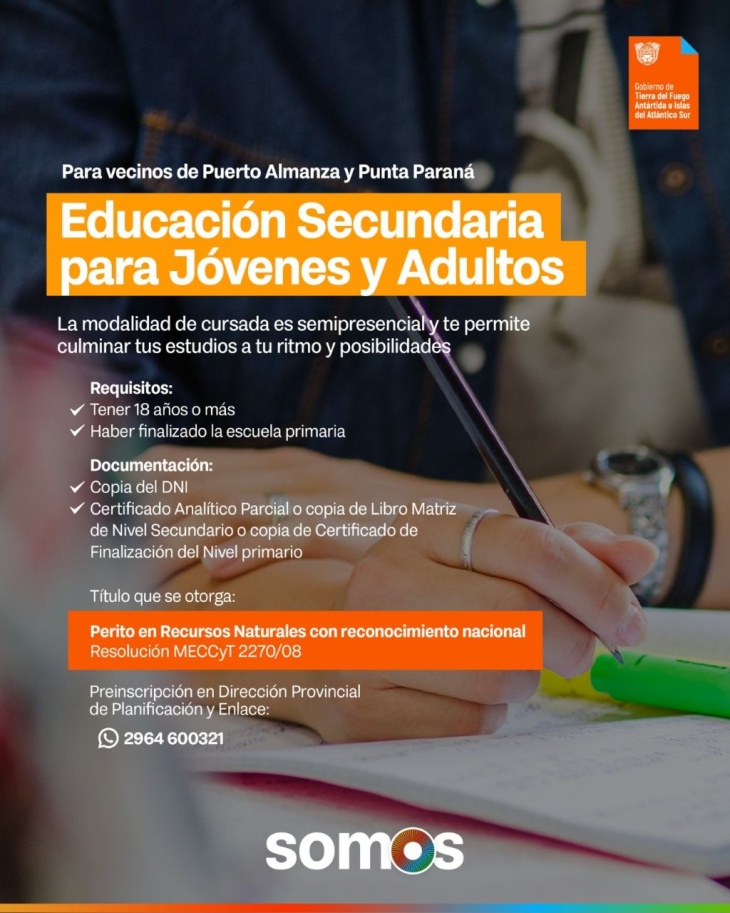 Los requisitos son; vivir en Puerto Almanza y Punta Parana, ser mayor de 18 años, haber finalizado la escuela primaria, presentar copia de DNI, certificado analítico parcial o copia de libro matriz de nivel secundario o copia de certificado de finalización del nivel primario.