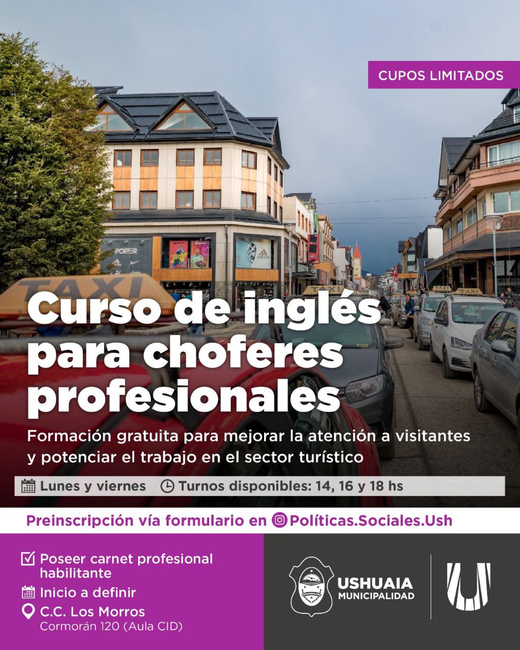 VIERNES 16 DE MAYO 2025La Municipalidad de Ushuaia, a través de la Red de Centros Comunitarios que depende de la Secretaría de Políticas Sociales, Sanitarias y Derechos Humanos, abre la inscripción al curso gratuito de inglés para choferes profesionales. La capacitación está dirigida a conductores y conductoras de taxi y remis que desempeñan tareas en contacto directo con turistas. El curso brindará herramientas básicas de comunicación en inglés para mejorar la atención y fortalecer el trabajo diario de quienes forman parte del servicio de transporte. Se dictará en el Centro Comunitario del barrio Los Morros, con tres turnos disponibles: a las 14:00, 16:00 y 18:00 horas, los días lunes y viernes. La fecha de inicio será comunicada oportunamente a las personas inscriptas. Los únicos requisitos para participar son contar con carnet profesional habilitante y completar la inscripción previa a través del formulario online. Los cupos son limitados por turno.