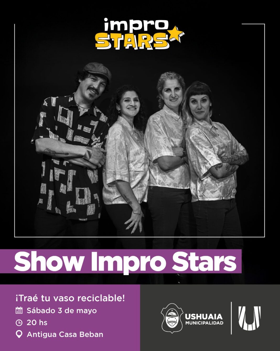 La Secretaría de Cultura y Educación de la Municipalidad de Ushuaia impulsará junto a Impro Stars este sábado 3 de mayo a las 20:00 horas en la Antigua Casa beban el espectáculo de improvisación “Show Impro Stars”.