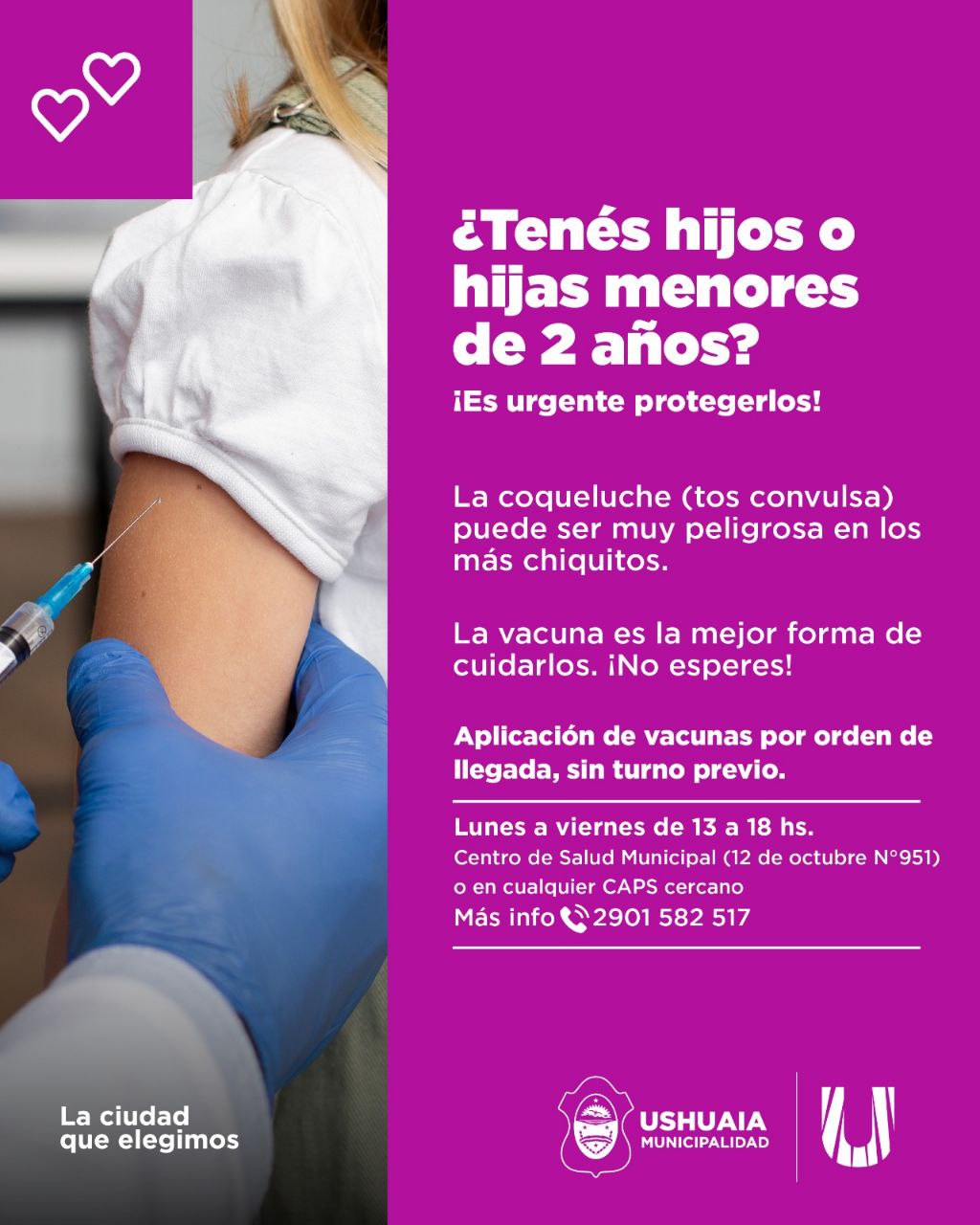 La Municipalidad de Ushuaia a través de la Secretaría de Políticas Sociales, Sanitarias y Derechos Humanos, lleva adelante una campaña especial de vacunación contra la coqueluche (tos convulsa), con el objetivo de prevenir contagios y proteger especialmente a los bebés y niños pequeños. Desde la Subsecretaría de Políticas Sanitarias explicaron que “la coqueluche es una enfermedad respiratoria altamente contagiosa que puede resultar grave, sobre todo en menores de dos años.