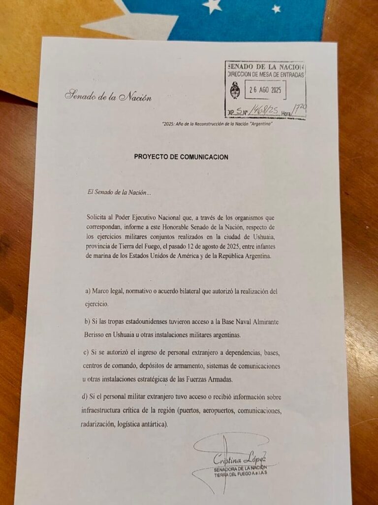 La senadora nacional por Tierra del Fuego, Cristina López, presentó un pedido de informes en el Senado de la Nación para que el Poder Ejecutivo nacional detalle bajo qué condiciones se realizaron los ejercicios militares conjuntos entre infantes de marina de la Argentina y de los Estados Unidos en la ciudad de Ushuaia el pasado 12 de agosto.