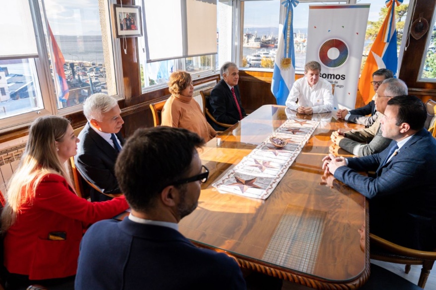 El gobernador Gustavo Melella junto al secretario de Malvinas, Antártida, Islas del Atlántico Sur y Asuntos Internacionales, Andrés Dachary; recibieron este lunes en Casa de Gobierno a los Embajadores de los países de Bolivia; Cuba; Pakistán; Palestina; Panamá y Serbia quienes visitaron oficialmente la provincia con motivo de participar de la Agenda prevista para la Conmemoración de los 41 años de la Gesta de Malvinas.