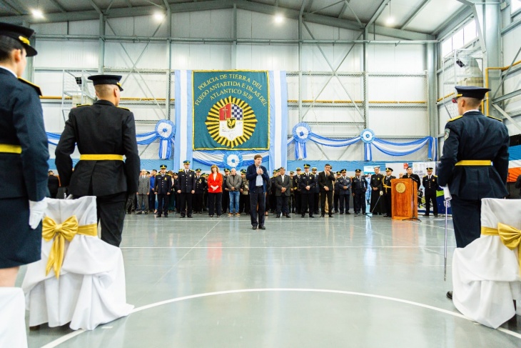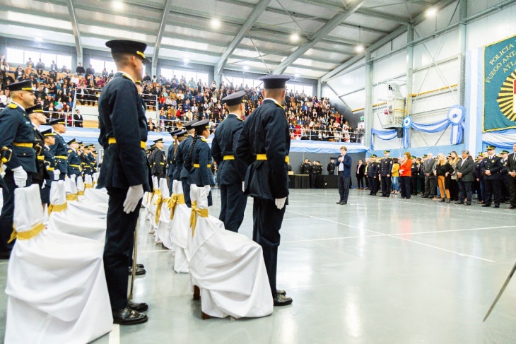 Este viernes se realizó el 27° cierre lectivo de la División Instituto Policiales con un acto encabezado por el gobernador de la provincia de Tierra del Fuego AIAS, Gustavo Melella, acompañado de la vicegobernadora, Mónica Urquiza; la ministra de Gobierno, Justicia y Derechos Humanos, Adriana Chapperón; el secretario de enlace con las Fuerzas de Seguridad, José Díaz; el Jefe de Policía, Comisario General Jacinto Rolón, el Director del Servicio Penitenciario, Claudio Cánovas, autoridades de las fuerzas de seguridad, legisladores y legisladoras provinciales, autoridades del Gobierno Provincial y autoridades Municipales.