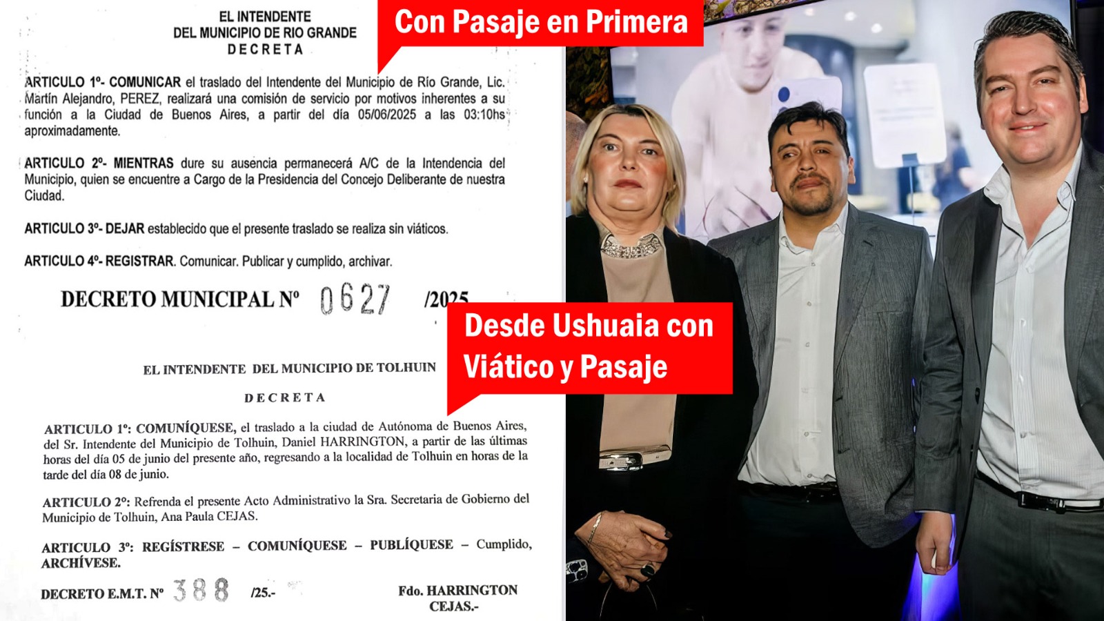 En sendos decretos de los municipios de Tolhuin y Río Grande queda plasmado el despilfarro por parte de Harrington y Pérez que gastaron más de 3 millones de pesos entre viáticos y pasajes para participar junto a Bertone de un evento en el que dirigentes y funcionarios libertarios y sus socios políticos del PRO celebraron el recorte a la industria.