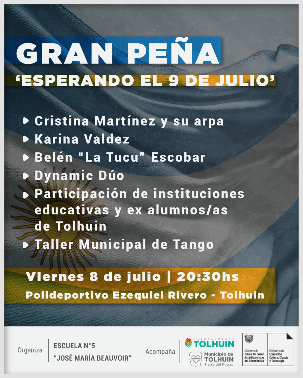Organizada por la Escuela N°5 José María Beauvoir, este viernes 8 de julio se realizará en Tolhuin la Peña “Esperando el 9 de Julio” en el Polideportivo Ezequiel Rivero.