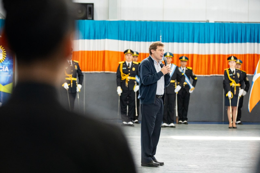 “Hoy es un día de fiesta y tienen que recordarlo siempre así, porque en este tiempo de preparación han superado muchas dificultades y han crecido, y las familias son testigos y los docentes también del crecimiento personal que han tenido”, destacó el mandatario ante los flamantes funcionarios policiales y sus familiares, poniendo en valor “el sacrificio que ustedes y sus familias realizaron”.