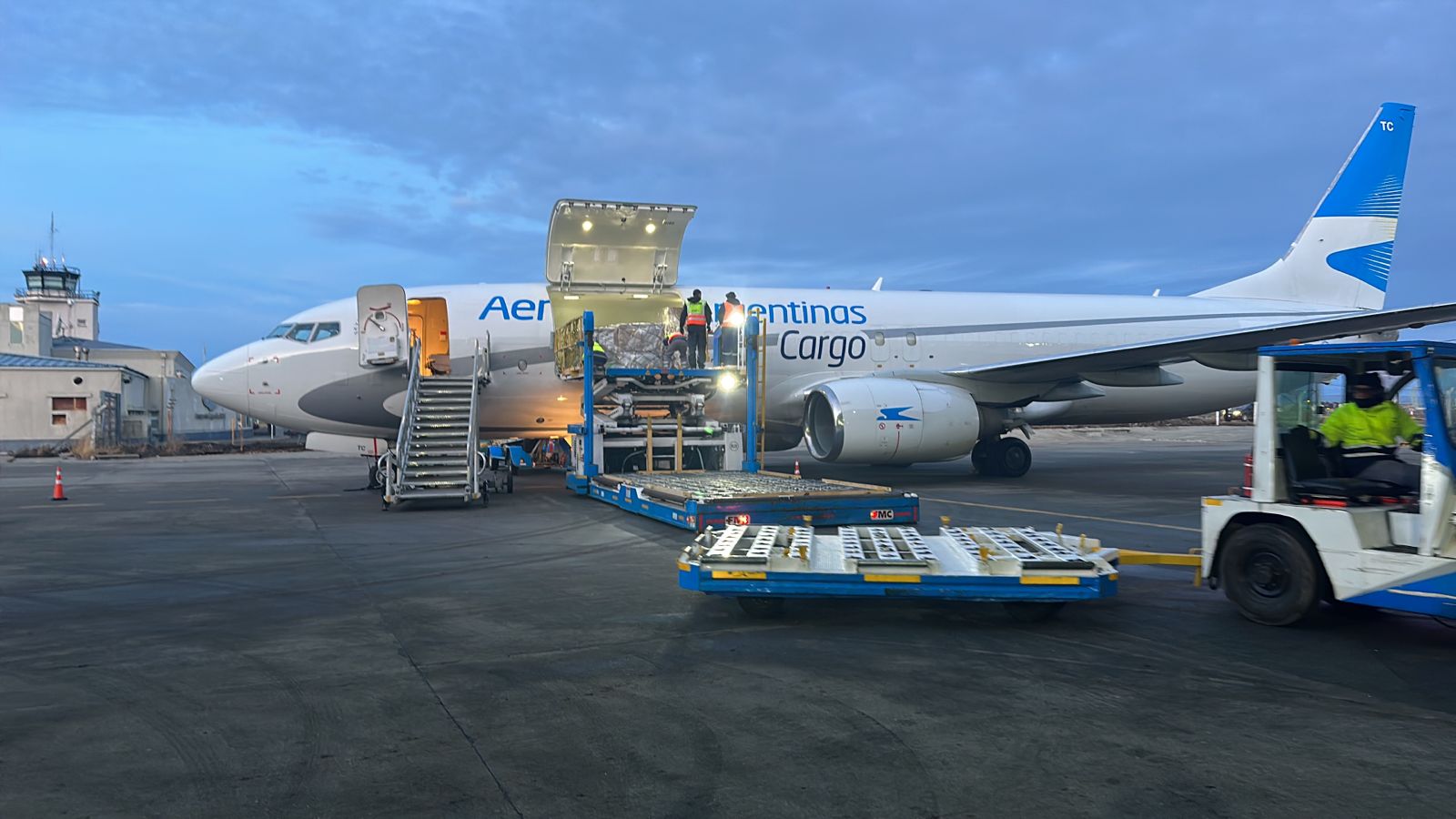 “Hoy estamos sacando pescado chileno por primera vez desde Río Grande a Estados Unidos. La carga viene desde Punta Arenas hasta Río Grande y se hace una conexión a Miami. La misma operación la hacemos desde Calafate, saliendo de Punta Arenas a Calafate cuando tenemos aviones disponibles. La carga desde Río Grande es la primera vez que se hace y se va en el avión carguero propiamente dicho”, explicó.